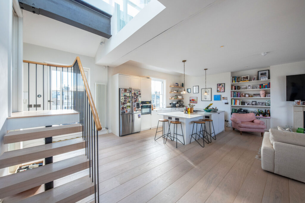 A beautifully presented top floor duplex with exceptionally light rooms and a truly magnificent reception room with open plan kitchen